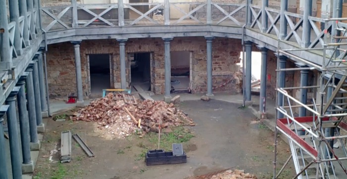 Raphaël Dallaporta, documente la lente mue de l’espace de la prison en centre d’art. Au cours des années précédentes, il a placé à des points de vue fixes des pièges photographiques, enregistrant de manière automatique des dizaines de milliers d’images, tour à tour les mouvements imprévisibles des cieux qu’il affectionne, la végétation tantôt sauvage tantôt domestiquée, les murs qui tombent, les dallages qui se font et se défont. Il n’est présenté ici qu’une étape de travail ; cette observation se prolongera bien au-delà, avec l’apparition du public, qui va s’approprier et repeupler progressivement ce lieu autrefois clos. Roman Eremchenko grâce à des algorithmes complexes de reconnaissance des formes, détache la vidéo de la tâche ennuyeuse du simple suivi de chantier. Eric Cordier à partir d’enregistrements de milieux carcéraux : bagne de St Laurent du Maroni, maison de correction d’Anniane… a réalisé un immense cut-up plus long et désynchronisé de la vidéo. Les sons ont été fragmentés et accumulés pour correspondre au même effet de sidération et de diffraction présent dans l’accumulation de 15 000 images.